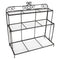 STURDY CONSTRUCTION- Made of wrought iron with a durable black powdercoated finish, the decorative frame folds flat for shipping and storage. The entire unit measures 36.5"W x 16"D x 36"H, with mesh shelves that drop in at 2 ½”, 20” and 30” from the floor.
