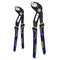 Each pair of locking pliers has a press-and-slide button that quickly adjusts the lower jaw