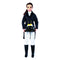 Megan is dressed to show in a formal shadbelly, white show shirt and tie, top hat, white breeches and black boots.