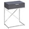 If you are looking to add a simple contemporary touch to your space, start with this accessible multi-functional accent side table. The spacious rectangular table top is constructed from solid MDF material and finished in a chic laminated grey for a modern look. The large storage drawer on metal glides is accented with a simple silver metal handle on top. A minimalist style chrome metal base with an X design frames the table keeping things. Whether you use this fashionable table as a nightstand in a modern bedroom space or as an end table, it adds instant style to any room!