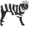 Black and white prisoner costume for dog features black and white striped shirt and a coordinating hat