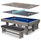 TOURNAMENT-STYLE PLAYFIELD – The Logan dining, ping pong, and billiards table combo features blended wool and nylon blue felt, K-66 gum rubber cushions for precision bounce, and antique bronze inlaid sights for perfect shot alignment.