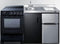 Dimensions & Build: 40.0" H x 63.0" W x 23.5" D, Full Capacity 3.2 cu.ft. (91 L) includes Summit CP34BSS refrigerator-freezer and REX2431BRT 220V electric range.
