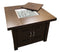 38 square tabletop, 28 tall. 19 inch square lid, 17 inch square burn area