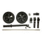 Wheel kit assembly includes two 7 inch wheels, center axle, center pull handle, two stabilizer feet, and hardware