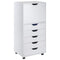 Simple and practical, The Halifax High Cabinet is the answer for organizing your documents, craft supplies, and much more. With five drawers plus an upper cabinet, the mobile cabinet holds more than the typical plastic storage units. Made of sturdy composite wood in a bright white finish.